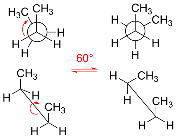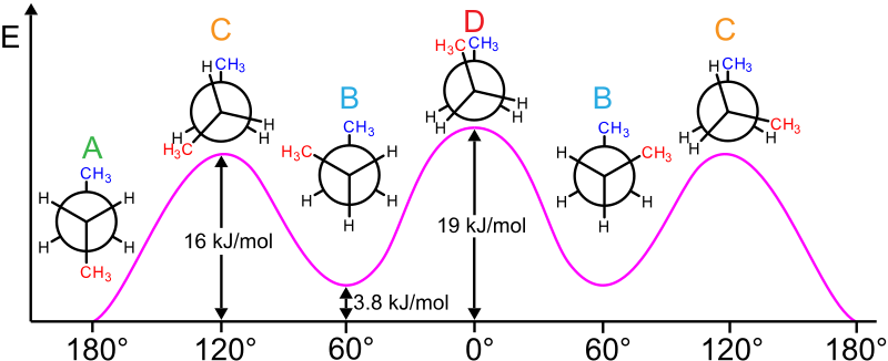 ์ด๋ ehthane์ ๊ฒฐํฉ๋ ์์ฉ๊ธฐ๊ฐ์ ๊ฑฐ๋ฆฌ๊ฐ ๋ณํํ๋ฉด์ ์๊ธฐ๋ steric strain์ด๋ค. ์๋ ์๋์ง๊ฐ ๊ทน์์ธ ๊ฒฝ์ฐ anti, ๊ทน๋์ธ ๊ฒฝ์ฐ gauche๋ผ๊ณ ๋ถ๋ฅธ๋ค.