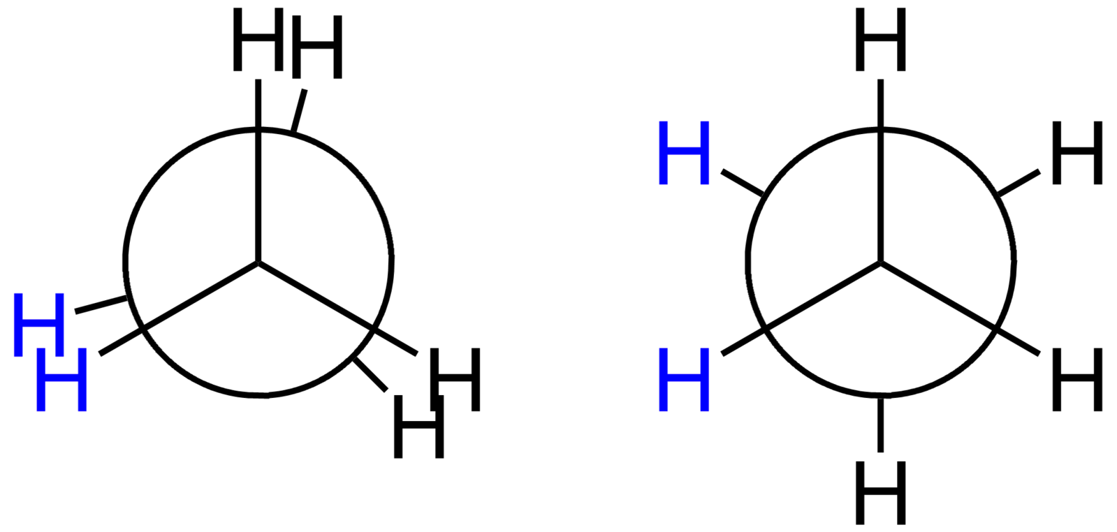 Newman projection์ ์์ ๊ฐ์ด ํ์ ๊ฐ๋ฅํ ๋ถ์๋ฅผ ํ์ชฝ ๋ฉด์์ ๋ฐ๋ผ๋ณธ ํํ๋ก ๊ทธ๋ฆฐ ๊ฒ์ด๋ค. ์ด๋ ์์ฉ๊ธฐ๊ฐ ์์ ํ ๊ฒน์ณ์ง๋ ๊ฒฝ์ฐ eclipse, ์๊ฐ๋ฆฐ ๊ฒฝ์ฐ staggered๋ผ๊ณ ๋ถ๋ฅธ๋ค.